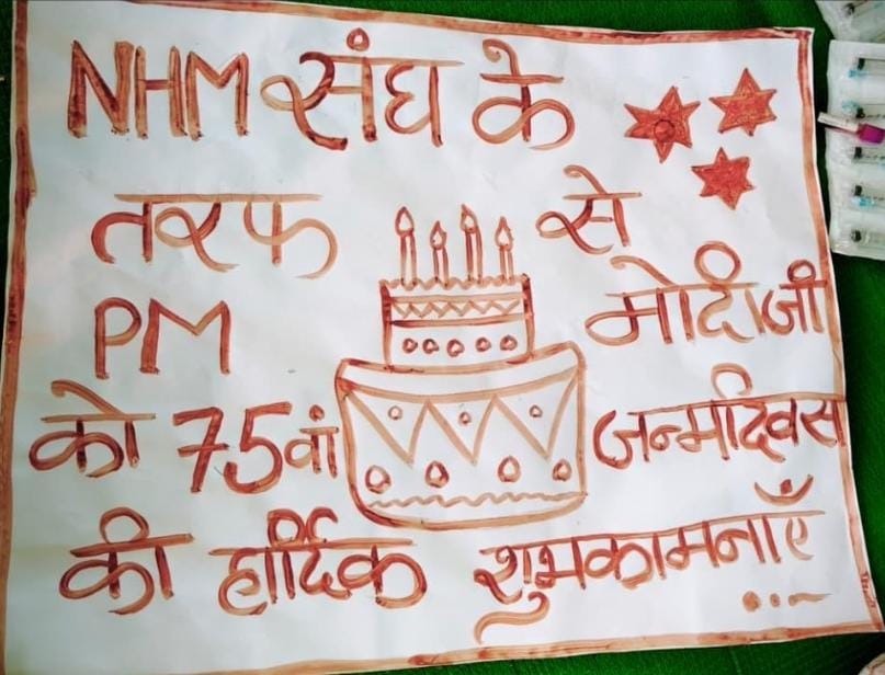 एनएचएम कर्मचारियों ने खून से लिखी प्रधानमंत्री को जन्मदिवस की शुभकामनाएं