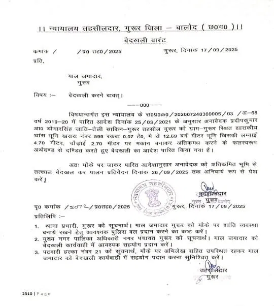 बालोद. सरकारी जमीन पर अतिक्रमण के मामले में तहसीलदार न्यायालय ने भाजपा समर्थित नगर पंचायत गुरूर के अध्यक्ष प्रदीप साहू के खिलाफ बेदखली का आदेश जारी किया है. न्यायालय ने प्रशासन को निर्देशित किया गया है कि 26 सितंबर से पहले अतिक्रमित भूमि पर कार्रवाई की जाए और प्रतिवेदन प्रस्तुत किया जाए.