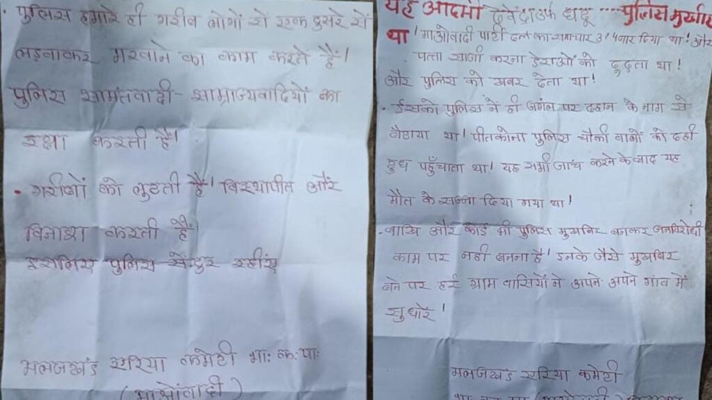 पर्चे में आगे लिखा कि बाकी और किसी को भी पुलिस मुखबिर बनकर जनविरोधी काम नहीं करना चाहिए. इनके जैसे मुखबिर बने हर ग्रामवासी अपने-अपने गांव में सुधारें.